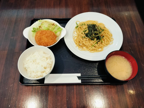 04/27 ほうれん草とベーコンの和風パスタ、牛肉コロッケ(珈琲付¥900-)