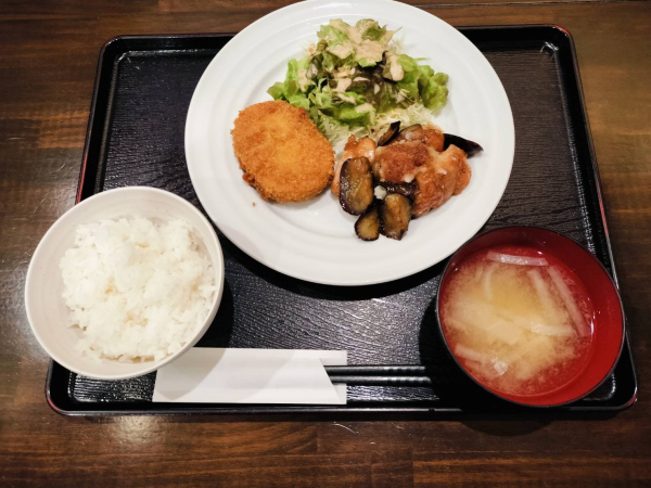 04/02 鶏肉とナスのゆずおろしポン酢、カレーコロッケ(珈琲付き¥900-)