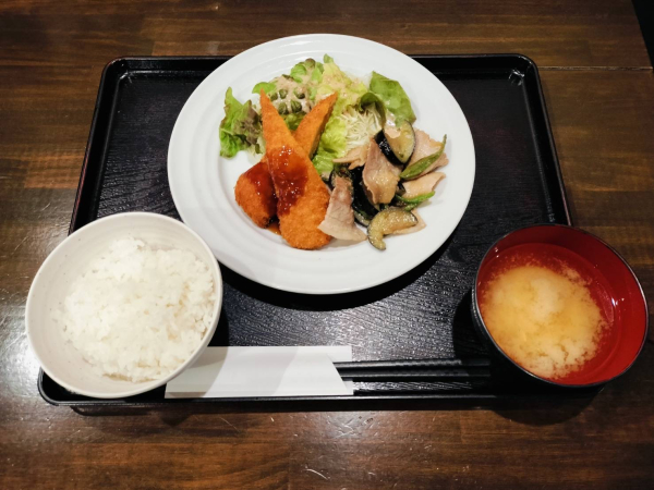03/25 豚肉とナスの味噌炒め、イカフライ(珈琲付¥900-)