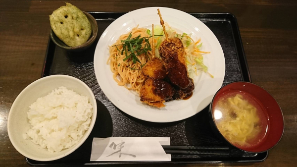 07/06 明太子スパゲティ、 串カツ(豚肉とゴボウ&玉ねぎ)(珈琲付¥850-)