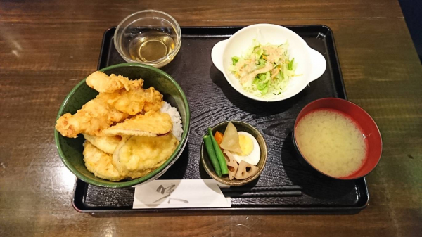 12/10 天丼(鶏肉、カボチャ、ナス、サツマイモ)、サラダ、小鉢付き(珈琲付¥850-)