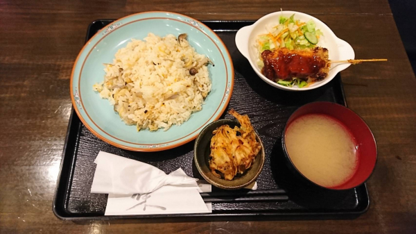 04/02 鶏とあさりとごぼうのピラフ、豚肉とごぼうの串カツ、野菜のかき揚げ(珈琲付¥850-)