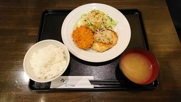 08/02 鶏ミンチと豆腐のゆずおろしハンバーグ、エビクリーミーコロッケ(珈琲付¥850-)