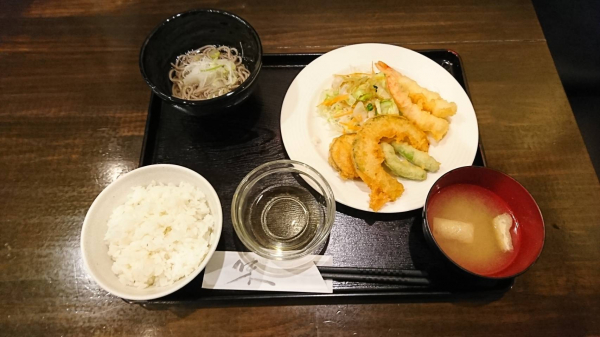 08/06 天ぷら(エビ、ナス、カボチャ、シシトウ)、ぶっかけおろしそば(珈琲付¥850-)