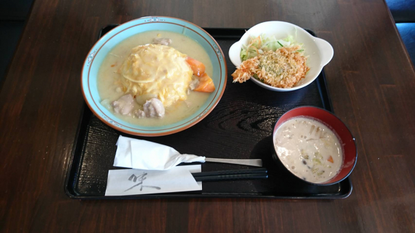 12/12 ホワイトソースのオムカレー、梅しそポテトエビフライ(珈琲付¥850-)