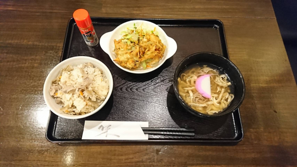 12/13 炊き込みご飯、エビと野菜のかき揚げ、あんかけきつねそば(珈琲付¥850-)